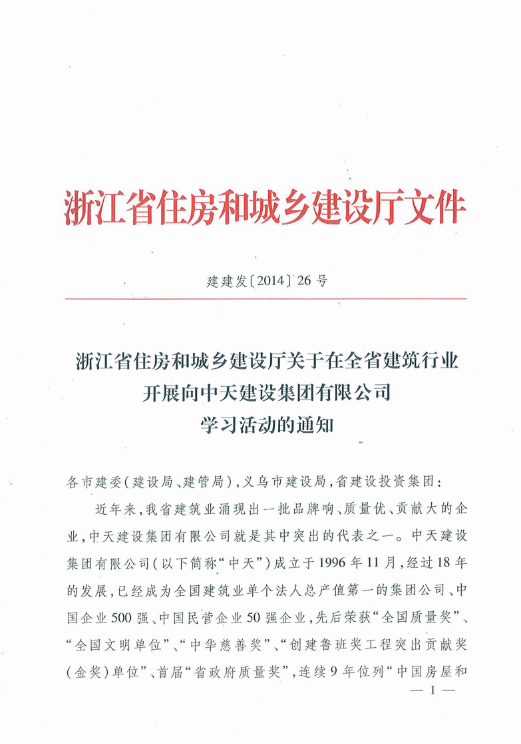 《浙江省住房和城乡建设厅关于在全省建筑行业开展向JJB电竞建设集团有限公司学习活动的通知》